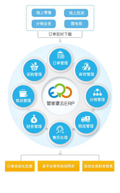 管家婆云ERP-網店版 全面解決網店管理問題,無論您是一開始選擇了網店創業,還是從傳統實體業務向網店業務拓展,管家婆云ERP都將助您建立起一個規范、高效的信息化管理平臺,告別網店管理的混亂局面